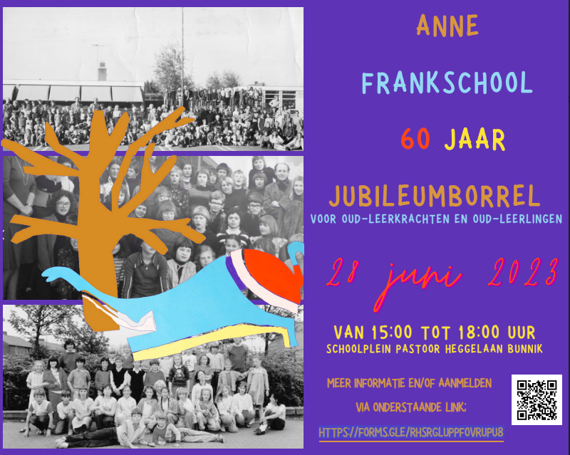 De Anne Frankschool in Bunnik bestaat dit jaar 60 jaar. Om dit te vieren, organiseert de school een jubileumweek. Onderdeel van deze week is een feestelijke middag waar iedereen die ooit hier op school heeft gezeten of gewerkt, van harte welkom is. De Anne Frankschool is al zes decennia een plek vol verhalen en avonturen. Er zijn generaties samengekomen, vriendschappen ontstaan en er is kennis doorgegeven. Op deze middag is het tijd om even terug te gaan in de tijd en oude tijden te herbeleven.